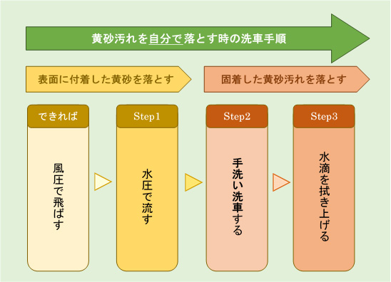 可能であればエアーなどの風圧で黄砂を予め落としておくことで塗装面に傷をつける心配はありません。