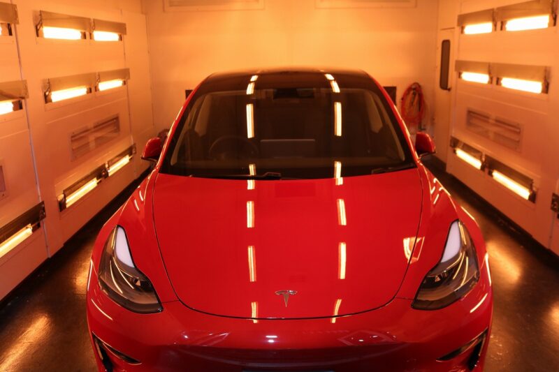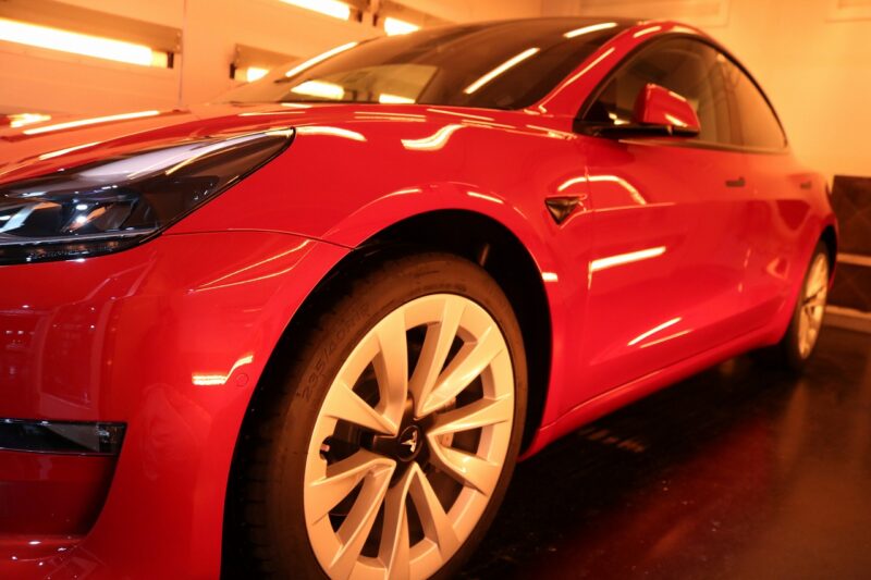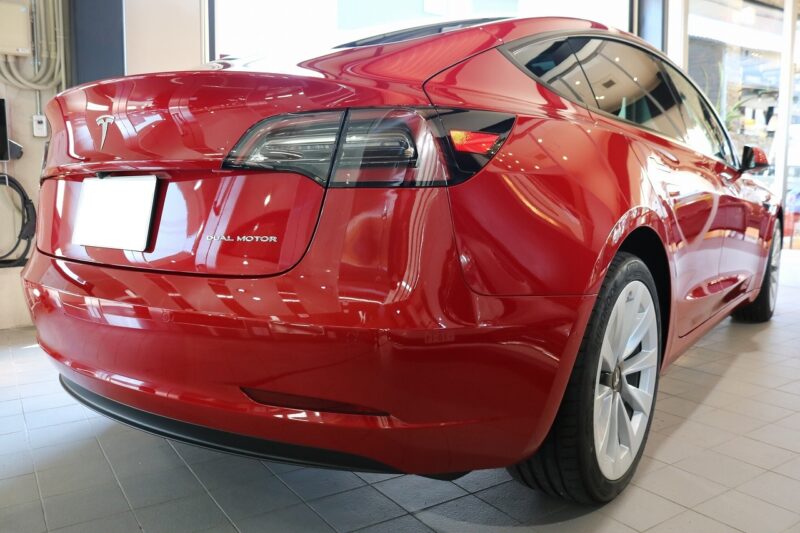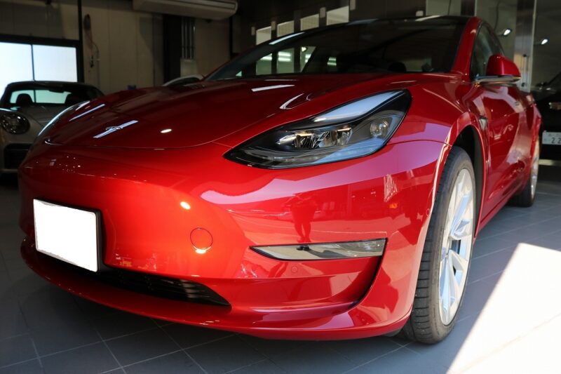 赤い車にカーコーティング!テスラモデル3に紫外線対策できるコーティングを施工させていただきました!東京都渋谷区より