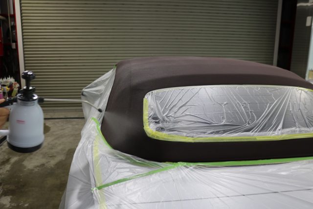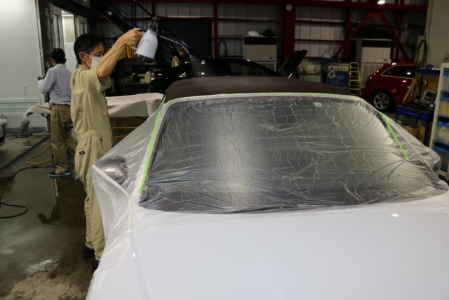 幌コートの魔術師が作業を行っております♪距離や染み込み具合に左右されますのでしっかりと確認しながらの作業となります。