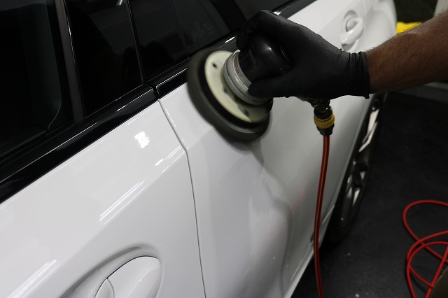 それにより、艶が引いてしまうことで見栄えも悪くなってしまい、コーティングの定着率も半減してしまう為「3工程に及ぶ鏡面研磨」で塗装面を削っていきます。