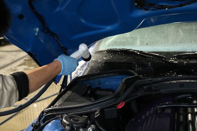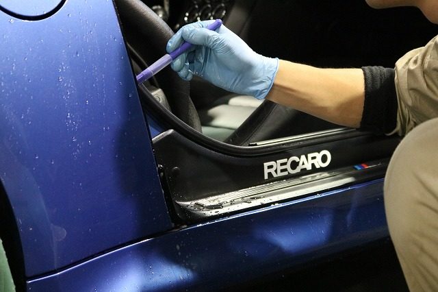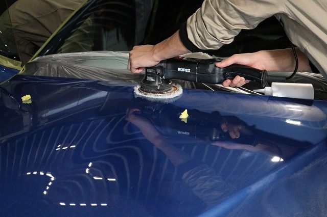 研磨後、当店ではコーティングの密着性を向上させる溶剤を塗布する大切なひと手間を加え、当店完備のコーティング専用ブースにてようやくコーティング作業となります。