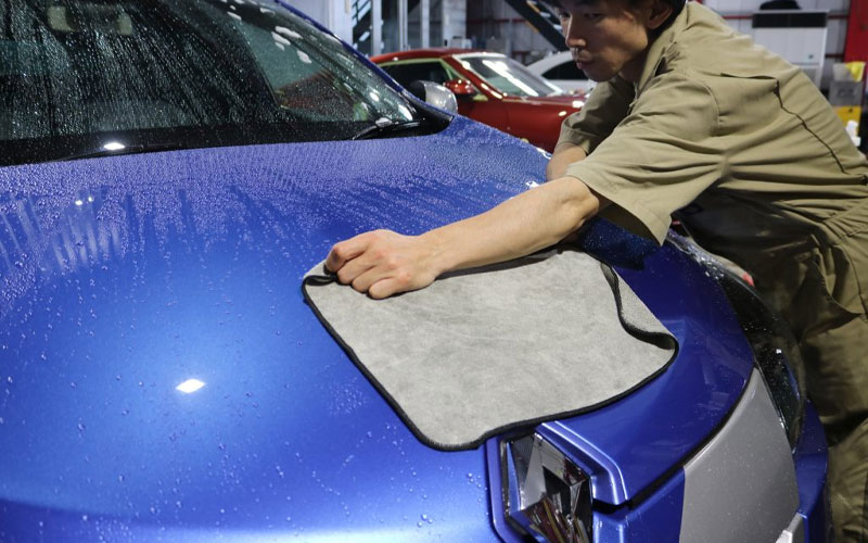 塗装面に水滴が残ってしまうとイオンデポジットなどのシミの原因となるため、しっかりと水分を拭き上げます。また、この時に使用するマイクロファイバークロスは塗装面にダメージを与えないように出来るだけ柔らかい素材を使用しましょう。
