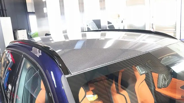 今回の施工ではボディ全体にフルプロテクションを施工し、飛び石や擦り傷が入りやすいフロント周辺だけでなくドアやフェンダーまで保護しました。さらにルーフにはカラープロテクションフィルムを施工しています。カラーフィルムはボディの印象を変えながら塗装面を保護できるのが特徴です。今回のようにカーボン調フィルムを施工することで、デザインのアクセントを加えながらルーフ面の保護も可能になります。フィルムは剥がすことで元の塗装状態に戻せるため、将来のイメージ変更にも対応しやすい点もメリットです。