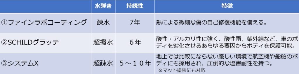 特にお勧めのセラミックコーティングは上表の通りとなります。