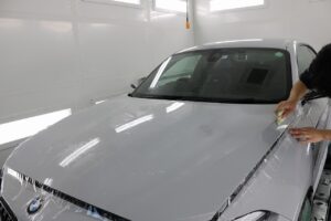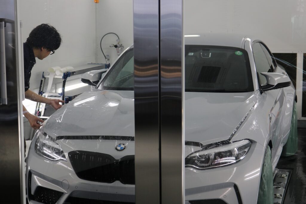 品質管理の為に空気中の小さな埃やゴミがフィルムに混入しないよう締め切った空間で作業するのですが、気温によってフィルムの伸ばしやすさ、貼り易さ、水の抜け易さに関わってきますのでブース内の室内温度もプロテクションフィルムを貼る上で重要です。