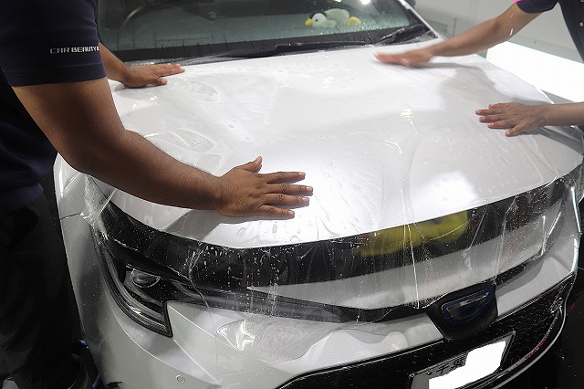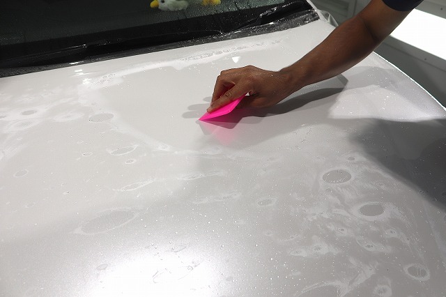 プロテクションフィルムを塗装面にのせた後は、専用のヘラで水抜きを行っていきます。水抜きの際に、プロテクションフィルムの上にシャンプーを塗布することで滑りが良くなり、のりずれを軽減することが出来ます。のりずれが起こってしまうと、薄い指紋のような跡が残ってしまいますので仕上がりに大きく影響してしまいます。適切なタイミングでシャンプーを使用し、のりずれのリスクを軽減しながら作業を行っています♪