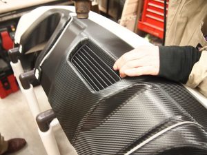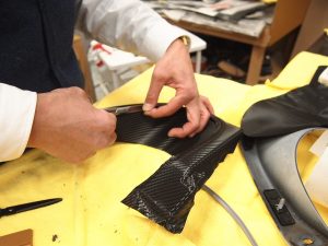 凹凸が深いところは、カーボンのパターンがズレない様に分割張りしていきます。