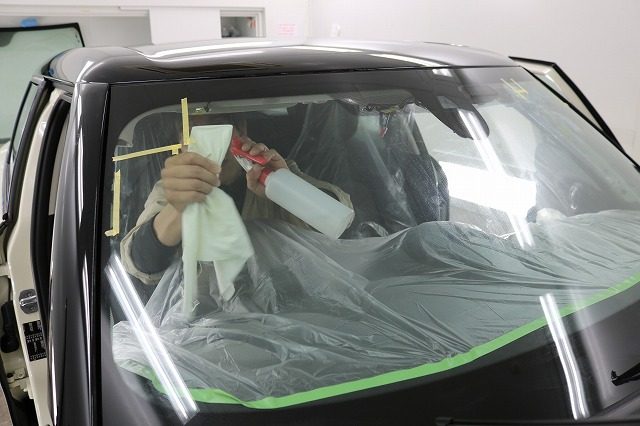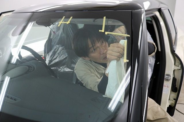 バックミラーやナビのフィルムアンテナなどは、取り外して隅々まで施工します。