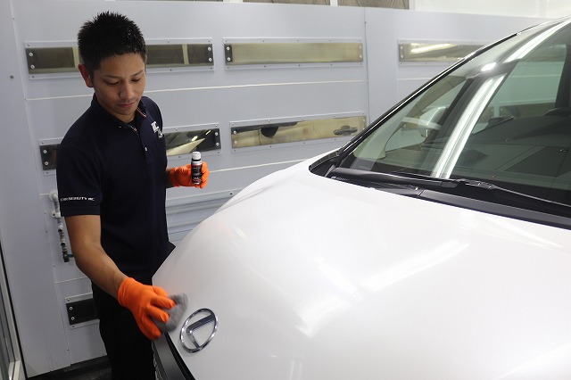 塗装面や樹脂パーツにコーティング剤が付着しないよう、丁寧に養生作業を行っていきます。