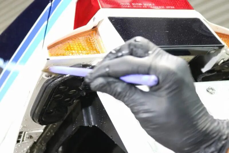 バイクコートの場合、タンクやカウルなどの塗装面は専用スポンジで塗布し、それ以外のエンジン周辺や足回りは吹き付けで隅々まで施工します。