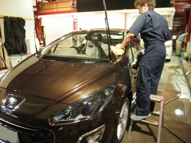 東京都品川区よりお越しのお車、プジョーにコンクリートミスト除去を行いました。