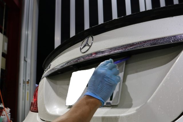 Y様のメルセデスベンツCLSに本日はウィンドウの研磨とボディの下地処理(細部洗浄)の施工をさせて頂きました。