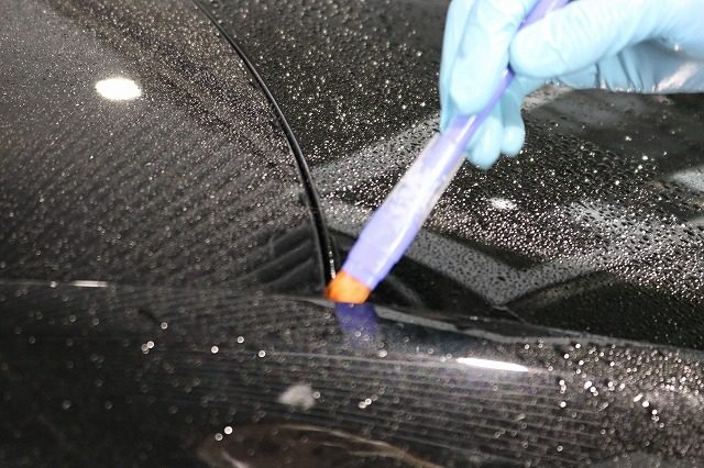 超撥水ガラスコーティングをコーティング専用ブースで塗布し、ムラなどがないよう丁寧に拭きあげていきます。