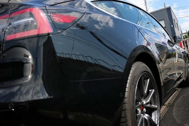 ガラスコーティング施工後のテスラモデル3をご覧ください。