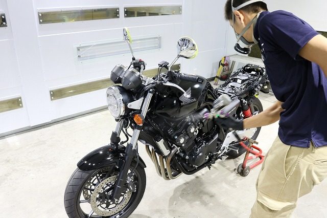 新車ホンダCB400で東京都よりご来店のM様ありがとうございます。今回バイクコーティングの定番商品CR-1のプレミアムフルコースでご案内させて頂きます。