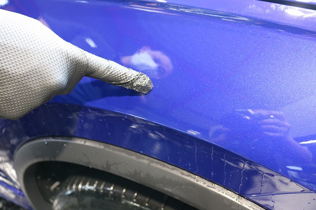 1工程目【除去作業】ですが、洗車をしたのち塗装に鉄粉除去剤を吹きかけ、ペンキを浮かし取る作業となります。鉄粉除去剤でペンキが取れない場合は、粘土を使用し物理的に塗装を擦って取り除きます。粘土で擦ることによって、少なからず塗装面に負担が加わり、ペンキを除去した箇所には細かいスクラッチ傷が残ってしまいます。