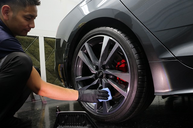 アウディS5に、オプションコーティングとしてホイールコーティング、撥水ガラスコーティング(ウィンドウコーティング)、メッキモールコーティングを施工いたしましたのでご紹介します。
