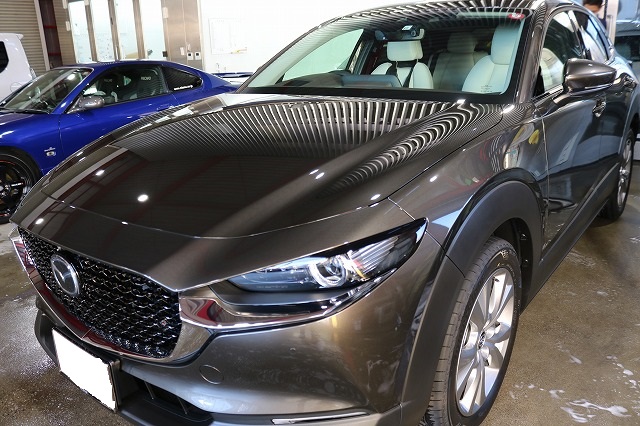 新車マツダ2に水が波のように引いていく親水性コーティングを施工致します。