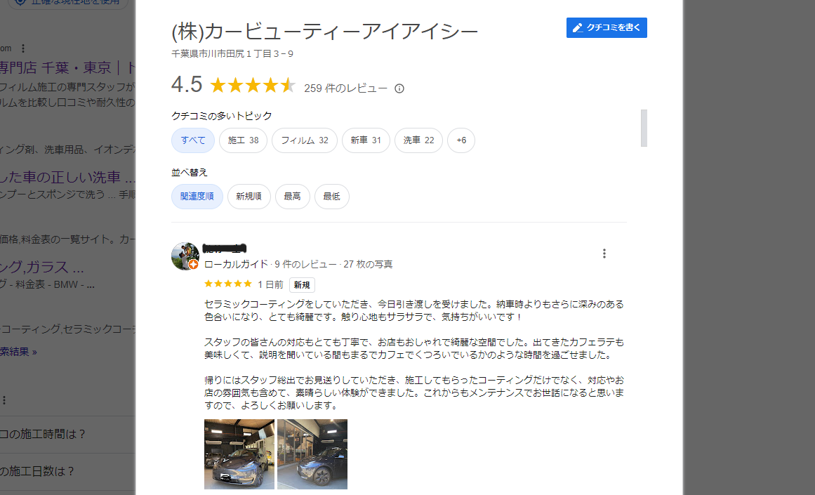 ガラスコーティング施工をお願いしようとしているお店の評判は「Googleの企業口コミ」や専用の口コミサイトで調べられます。Googleで店名を検索すると、企業情報として「概要・口コミ・商品・写真」といった項目で詳しく知ることができます。