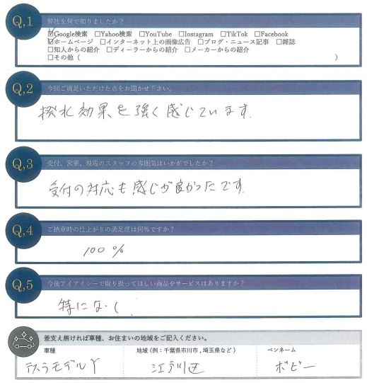 アイアイシーでは1ヶ月後に点検洗車を行いお客様の声を頂戴しております