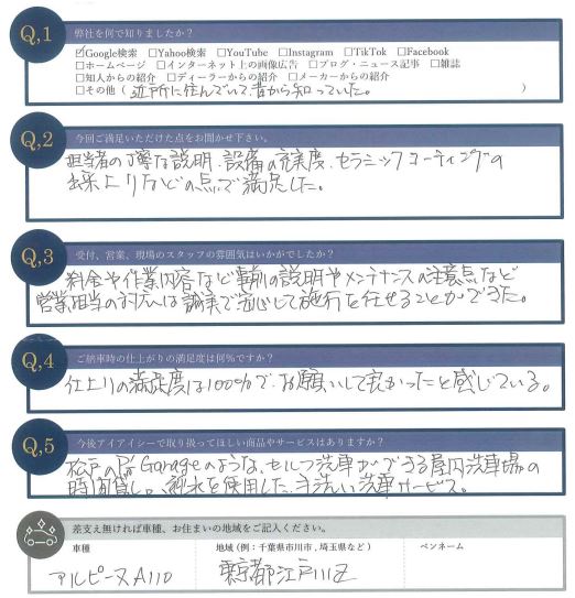 担当者の丁寧な説明、設備の充実度、セラミックコーティングの出来上りなどの点で満足した。