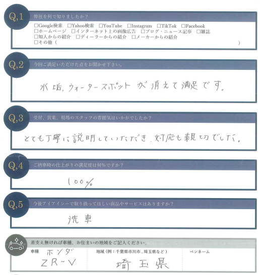 アイアイシーでは1ヶ月後に点検洗車を行いお客様の声を頂戴しております